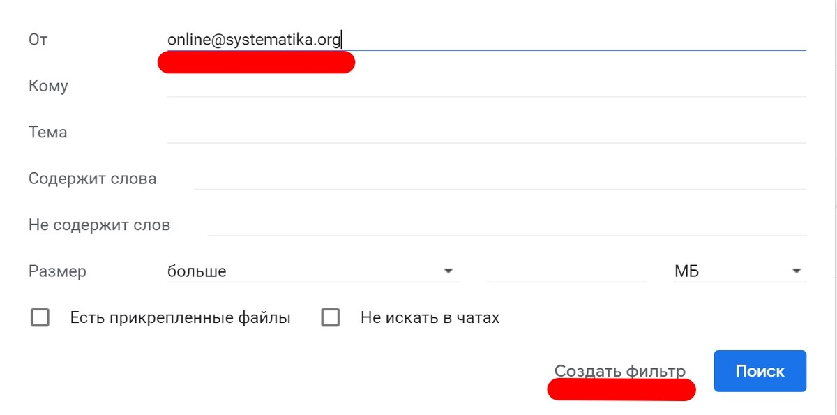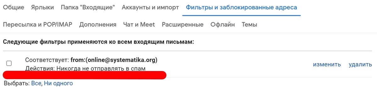7. Поставьте галочку «Никогда не отправлять в спам» и нажмите кнопку «Создать фильтр»