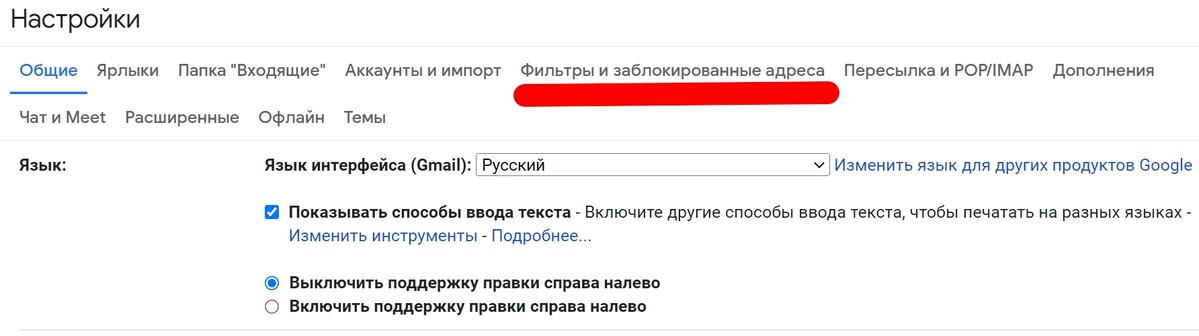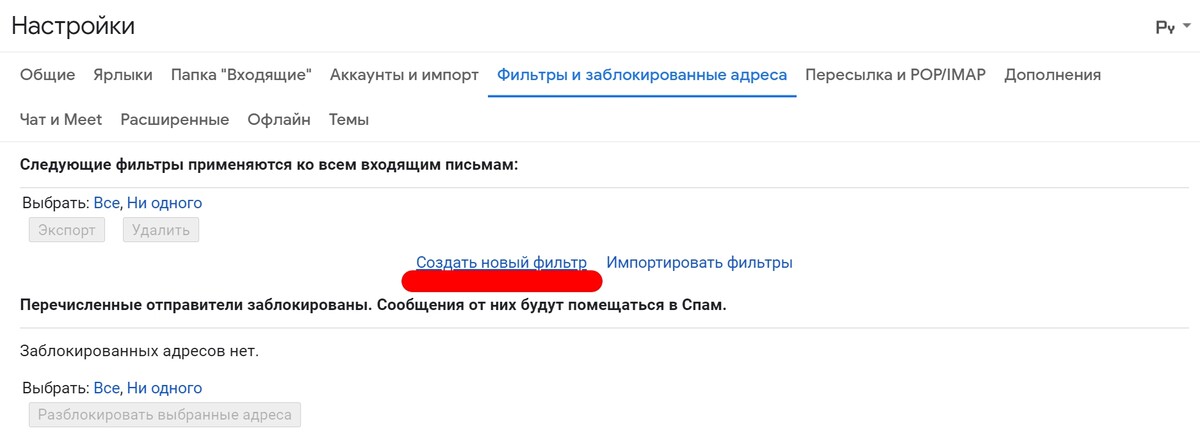 - Выберите вкладку «Фильтры и заблокированные адреса»